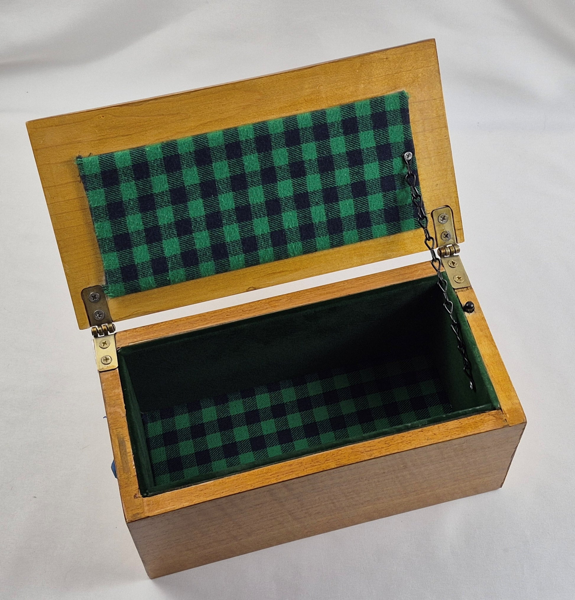 The interior of this box is lighted and is lined with a black & green check pattern and green felt.