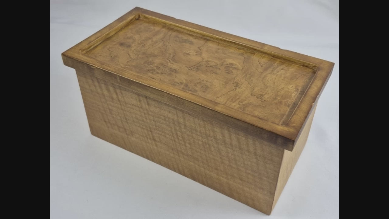 Here's another veneer experiment with mahogany veneer on the sides and maple burl veneer on top. Veneer allows the use of expensive and/or exotic wood types without their high cost and if done properly is virtually invisible to the casual observer.