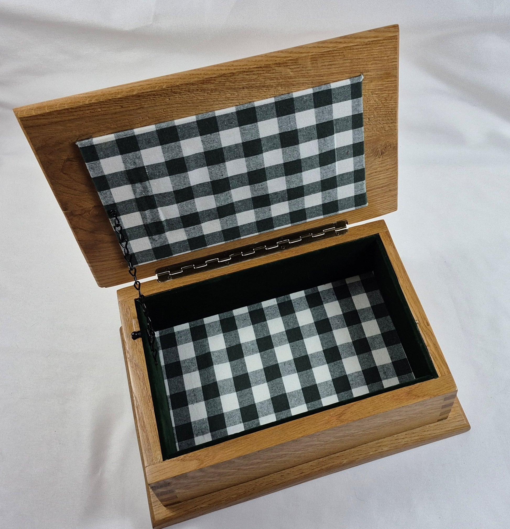This special keepsake box is lined with a green & white check pattern and green felt that meshes well with the natural color of the oak.